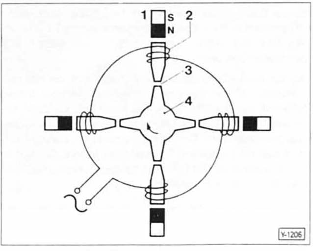 Da sich der verteileranker - 4 - mit der verteilerwelle dreht, ändert sich der abstand - 3 - zwischen verteileranker und den statorpolen ständig. Dadurch wird in die magnetspule - 2 - eine wechselspannung induziert. Entsprechend den spannungsänderungen löst das schaltgerät zusammen mit der zündspule den zündfunken aus. Die zündung erfolgt immer dann, wenn sich die pole des verteilerankers gerade wieder von den statorpolen entfernen. Weitere in der abbildung dargestellte teile sind: - 1 - dauermagnet, - s - südpol und - n - nordpol des dauermagneten.