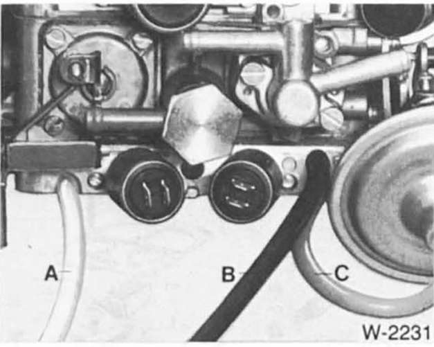 A=spätzündung, weißer schlauch; B=frühzundung, schwarzer schlauch; C = drosselklappenansteller. Blauer schlauch.