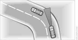 In Kurven kann es aufgrund des eingeschränkten Erkennungsbereichs des Radarsensors zu Situationen kommen, in denen ein vorausfahrendes Fahrzeug nicht mehr oder deutlich verspätet erkannt wird.